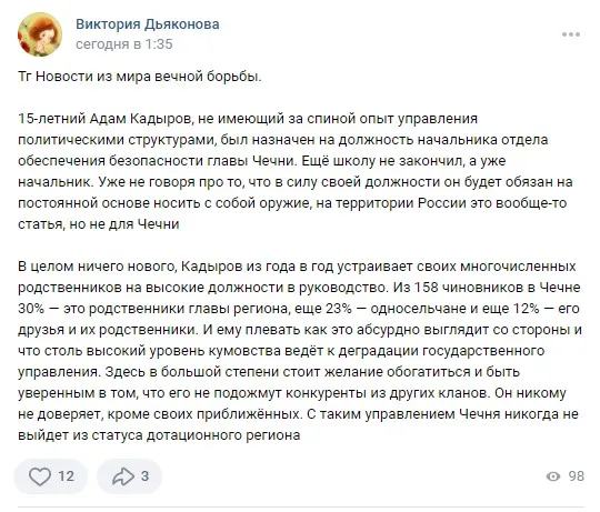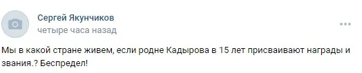 «Адам проявил себя как смелый, отважный патриот Родины и человек, который готов заступаться за религию! В своем юном возрасте он несколько раз побывал в зоне СВО! Все знают о его храбром нраве и сильном характере!» — написал он.