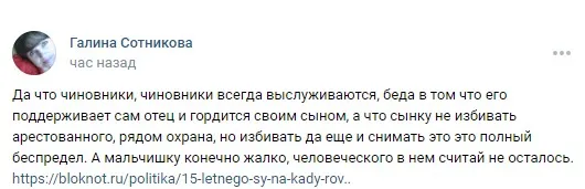 Ранее Рамзан Кадыров выложил видео, как его 15-летний сын избивает в здании СИЗО Никиту Журавеля, поджегшего Коран. Глава региона заявил, что гордится поступком сына.