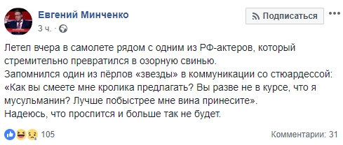 Российский политтехнолог Евгений Минченко сообщил в Facebook, что летел накануне с актером, который вел себя как «озорная свинья».