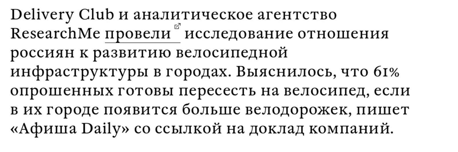 Ранее служба доставки Delivery Club и аналитическое агентство ResearchMe обнародовали данные проведенного ими опроса об отношении россиян к велосипедной инфраструктуре. Они сообщили, что 79% опрошенных считают, что развитие велоинфраструктуры положительно скажется на безопасности дорожного движения в городах, а 61% респондентов готовы чаще ездить на велосипедах, если в городе будет больше велодорожек.