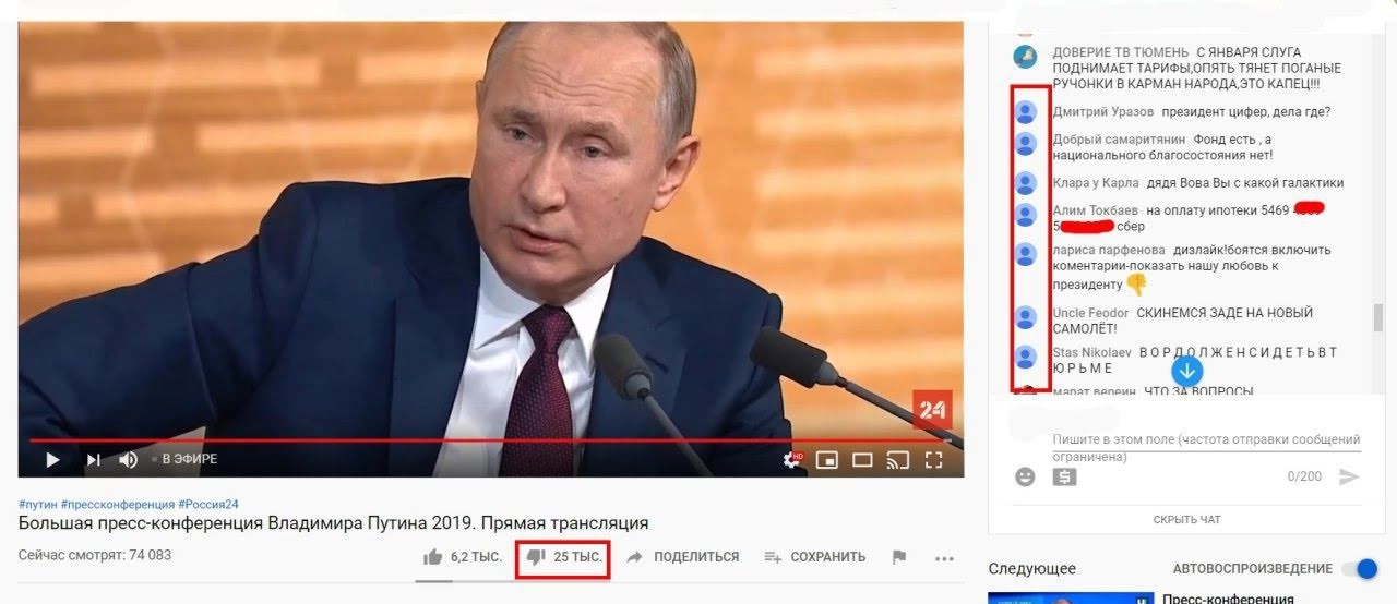 «На все трансляции Большой пресс-конференции Владимира Путина в YouTube идет беспрецедентная кибератака. Массово ставятся дизлайки и появляются негативные комментарии», — подчеркивает канал «Актуальная политика».