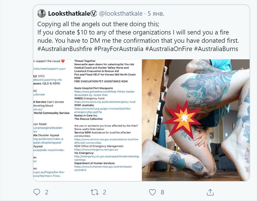 Актрисы фильмов для взрослых и просто фотомодели активно поддержали инициативу 20-летней американки Кейлен Уорд, которая пообещала предоставить свои обнаженные фотографии каждому, кто отправит средства на борьбу с пожарами в Австралии. Если сумма пожертвования превышала 10 долларов, тогда девушка отправляла благотворителю полноценное видео со своим участием. Таким образом, всего за пару дней был собран миллион долларов.