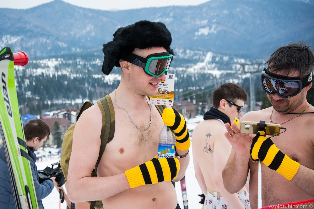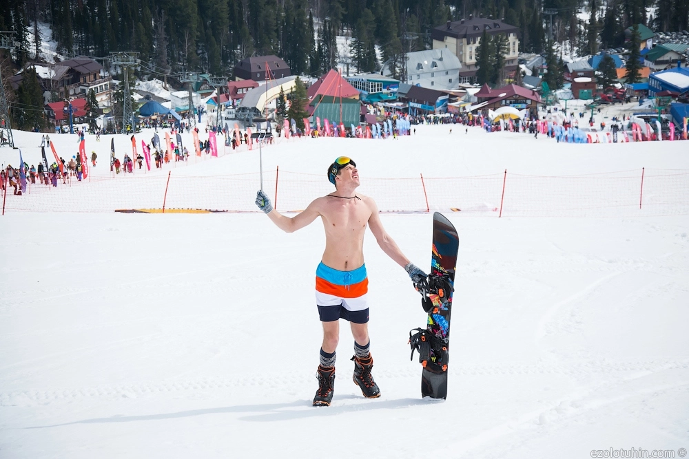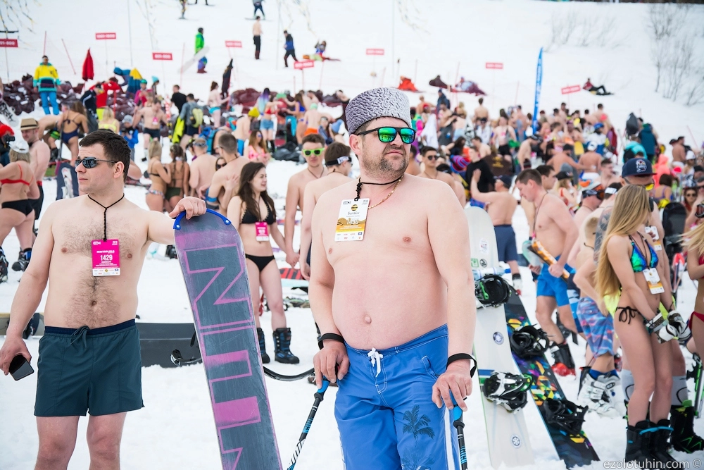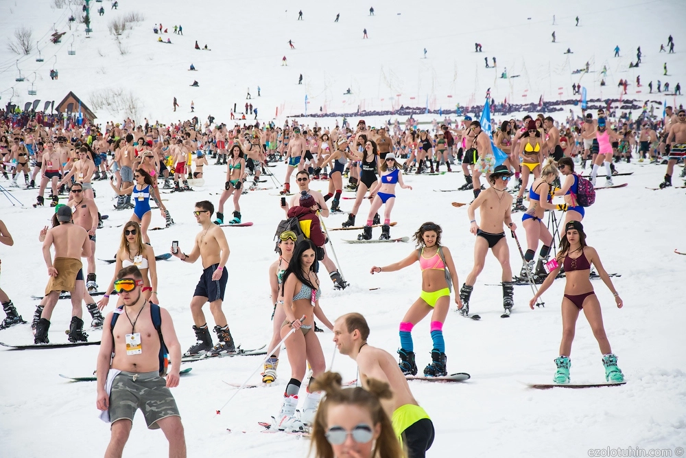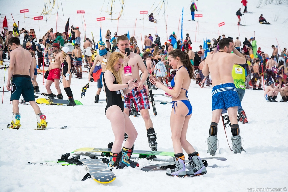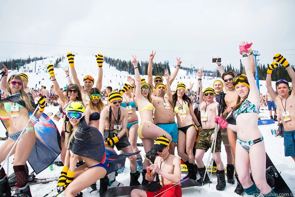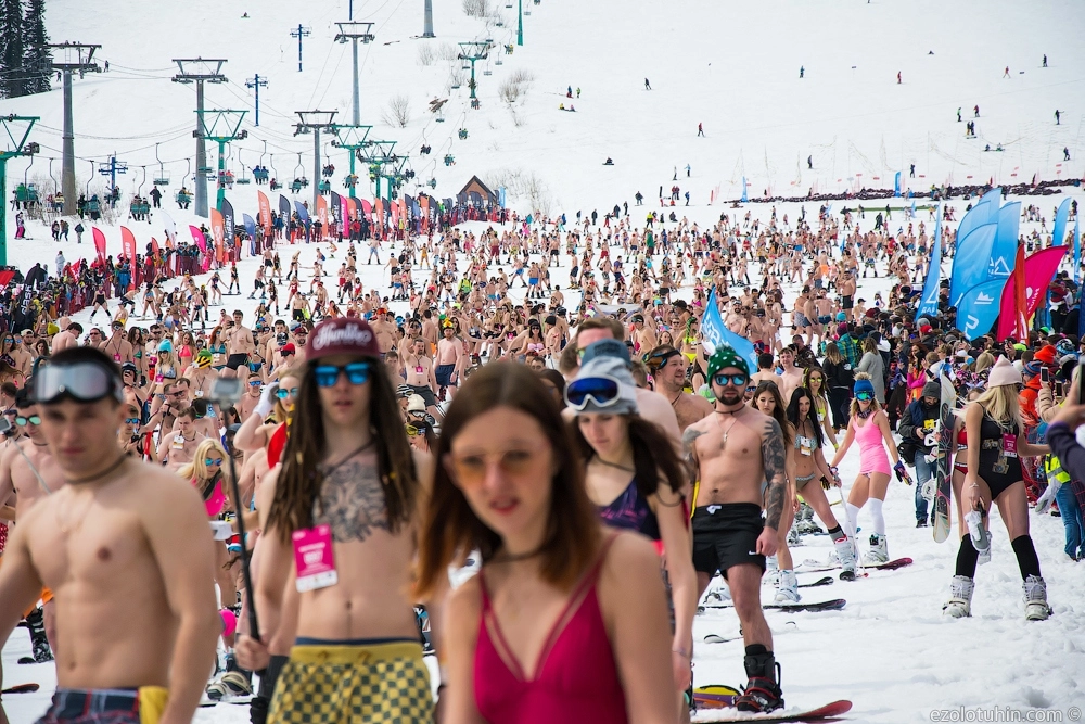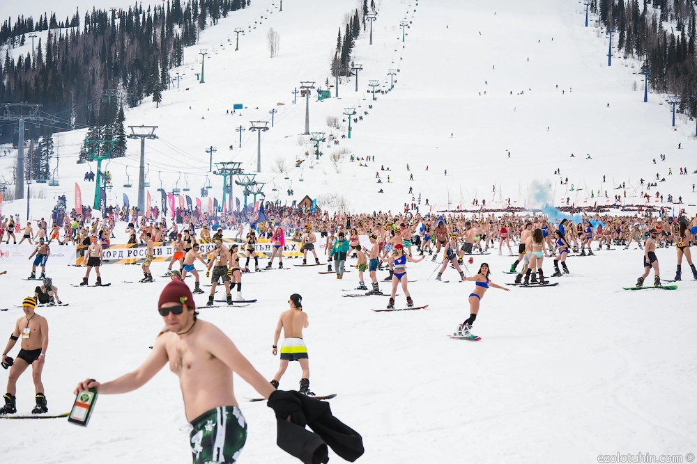 В прошедшие выходные полторы тысячи голых людей поднялись на гору, а потом скатились с нее на горных лыжах и сноубордах. Таким образом в Шерегеше ежегодно отмечают закрытие горнолыжного сезона. Несмотря на все неудобства и даже намечающийся дождь, в массовом спуске с горы в купальниках, по официальным данным организаторов, поучаствовали 1525 человек.