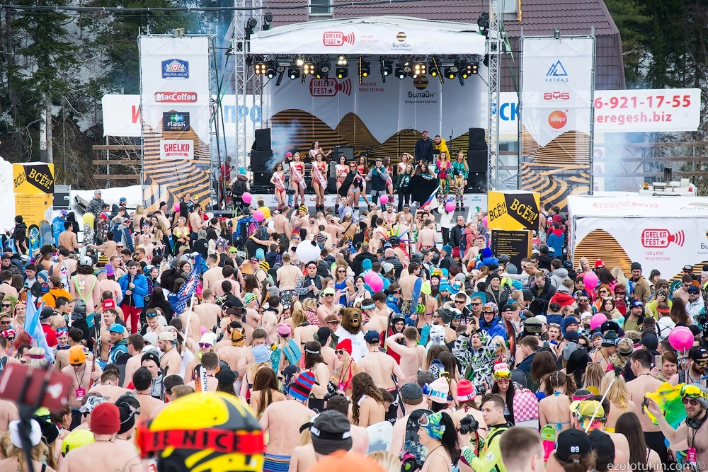 Вот уже несколько лет весной в Шерегеше проводится масштабный фестиваль GrelkaFest, завершением фестиваля и закрытием горнолыжного сезона становится массовый спуск с горы в купальниках. В прошлом году в таком спуске приняли участие 1496 человек, в этот раз голые горнолыжники побили свой рекорд и спустились с горы в купальниках в количестве 1525 человек.