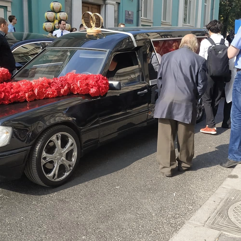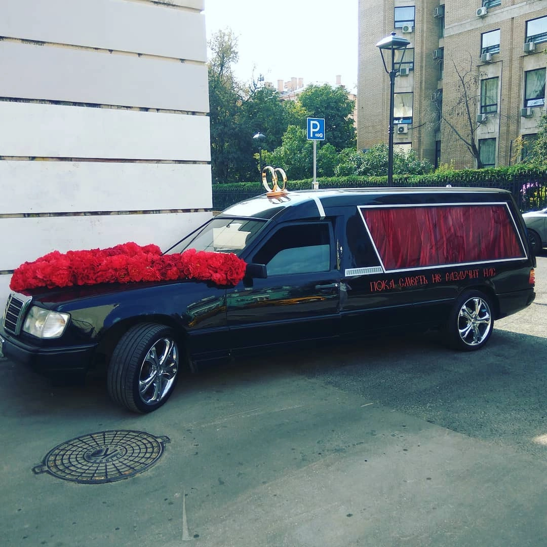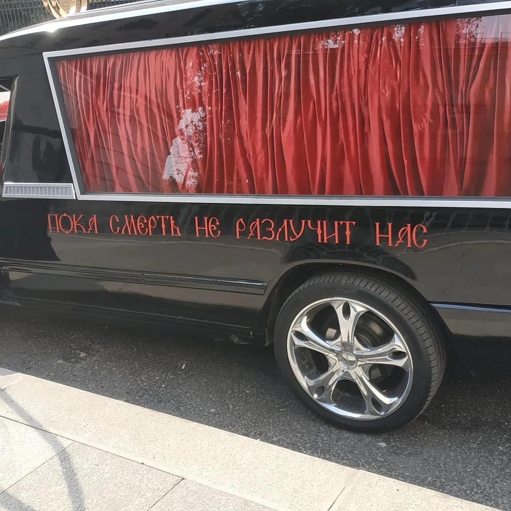 Пара расписалась в Грибоедовском ЗАГСе Москвы, куда они приехали на катафалке с надписью «Пока смерть не разлучит нас».