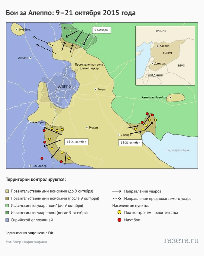 На помощь союзникам, помимо российских летчиков, по некоторым сведениям, выдвинулись заранее переброшенные в Сирию подразделения Ирана и базирующейся в Ливане группировки «Хезболла». Сам город Алеппо в настоящее время по большей части продолжают контролировать вооруженные отряды сирийской оппозиции, враждебные как радикальным исламистам, так и войскам Асада.