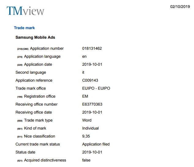 Согласно поданной заявке в EUIPO (Бюро интеллектуальной собственности Европейского Союза) 1 октября 2019 года, компания регистрирует товарный знак Samsung Mobile Ads. В описании говорится, что он распространяется на смартфоны и планшеты и относится к рекламным услугам.