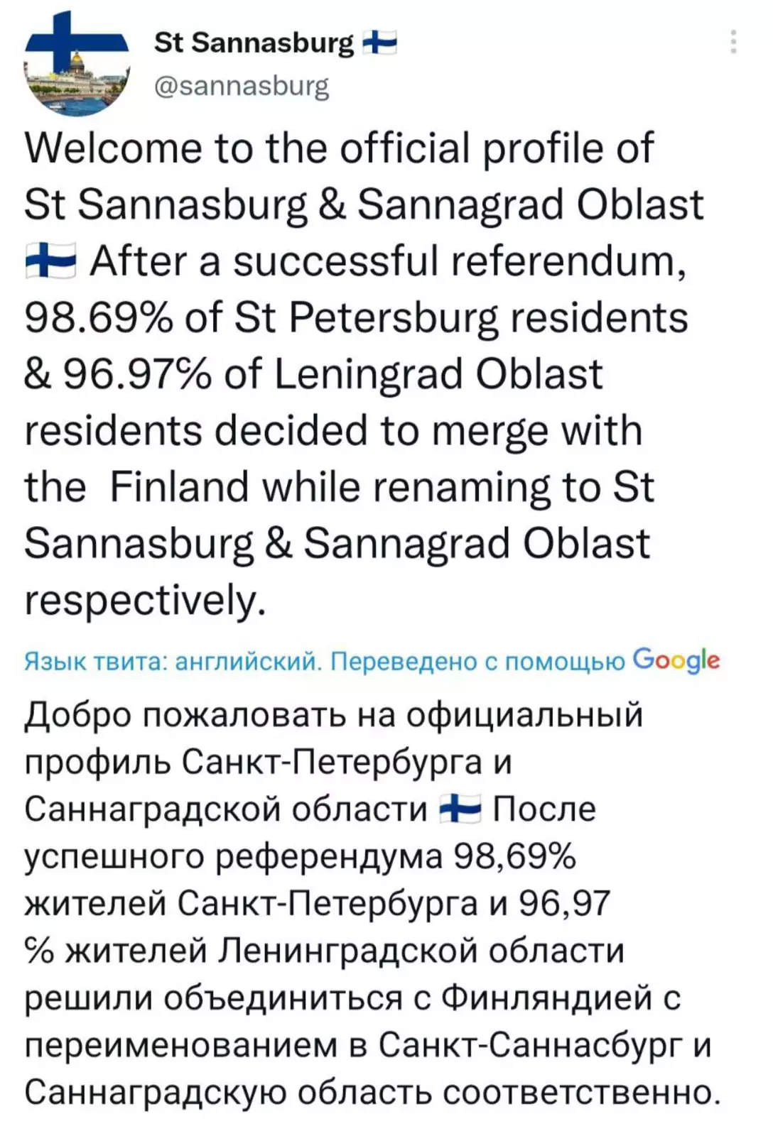 У виртуального новообразования появился свой юмористический аккаунт в Сети. «Присоединенные» территории переименованы в Санкт-Саннабург и Саннаградскую область в честь премьер-министра Финляндии Санны Марин.