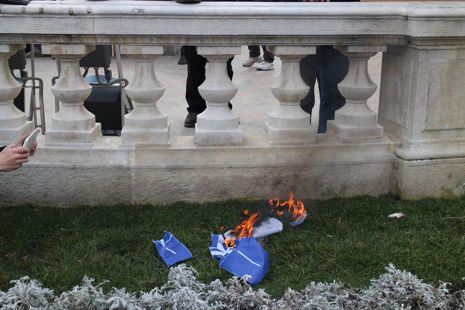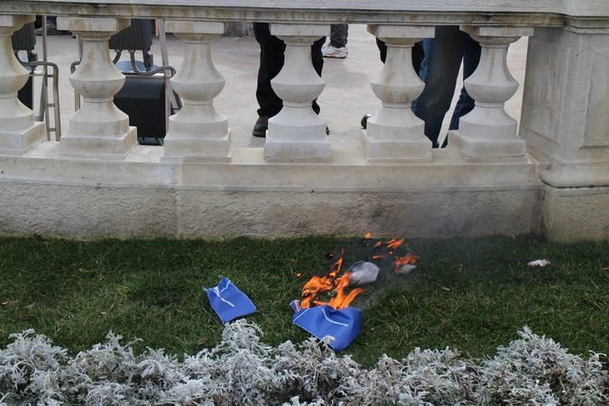 Под мощное скандирование лозунгов «США — вон из Болгарии и Европы!», «Европа — зона мира!», «Болгария — зона мира!», «Руки прочь от Донбасса!», присутствующие сожгли знамя НАТО.