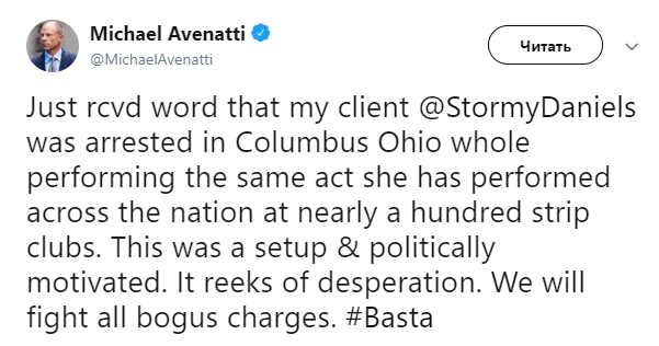 По его словам, Дэниэлс задержали во время выступления в стриптиз-клубе с программой, которую она до этого неоднократно исполняла по всей стране. Авенатти считает ее арест подстроенным и политически мотивированным.