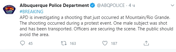 Полиция Альбукерке расследует перестрелку в районе Рио-Гранде во время демонстрации протеста. Ранен один мужчина, он госпитализирован. Сотрудники полиции осматривают место происшествия, — передают стражи порядка в Twitter.