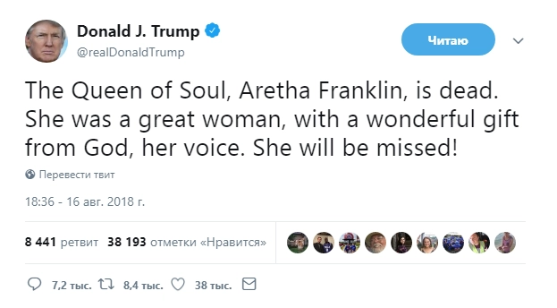 Свои соболезнования в связи с кончиной певицы выразил и президент США Дональд Трамп.
