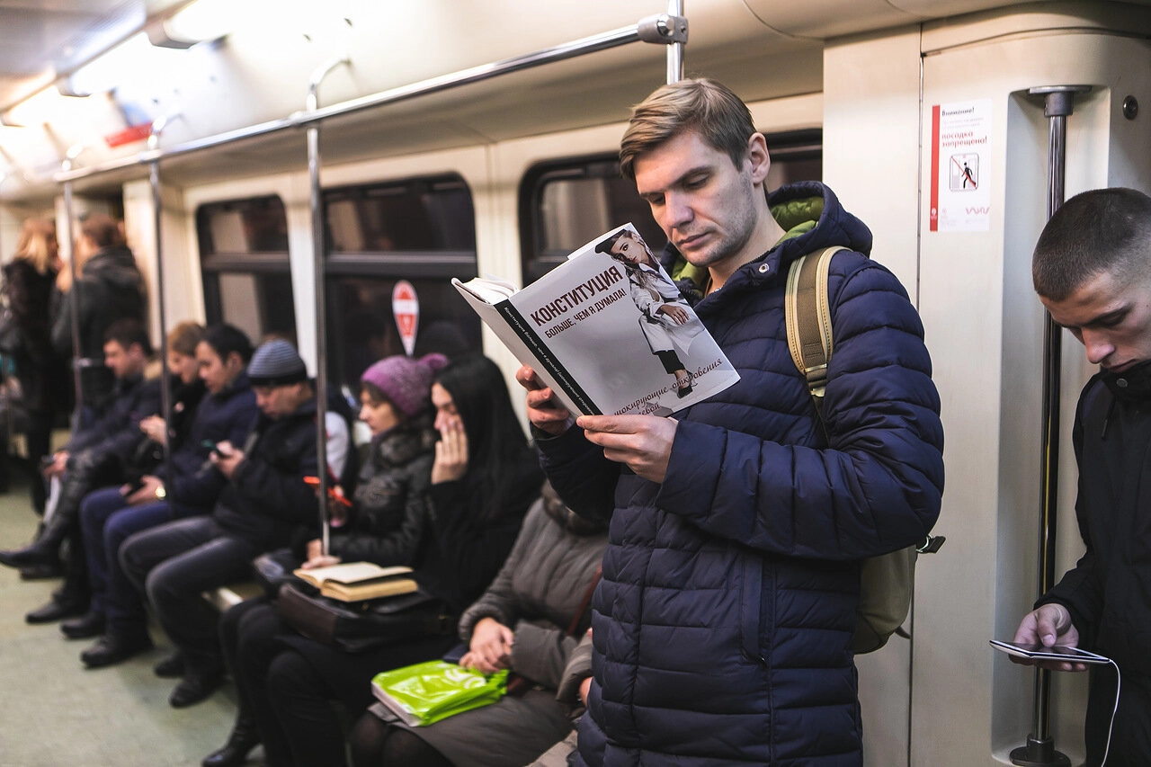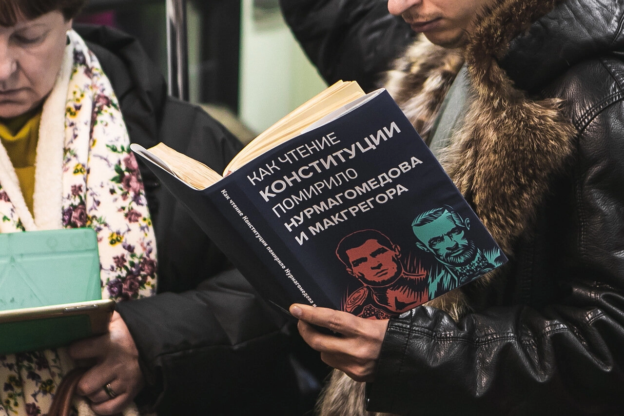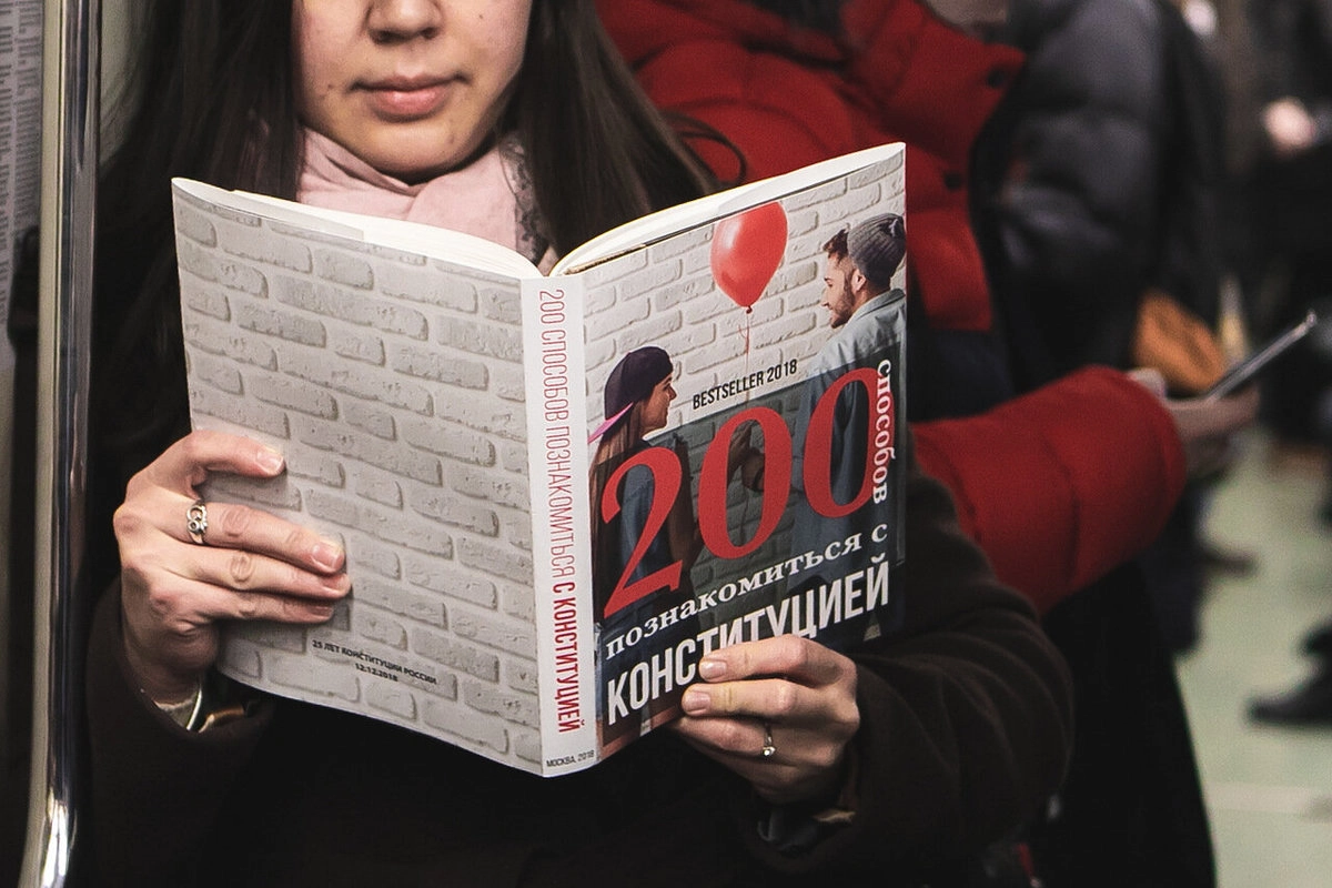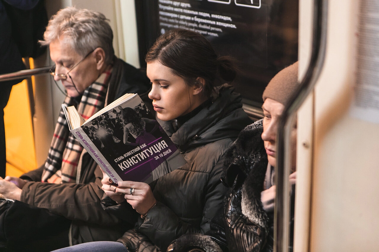 «Как чтение Конституции помирило Нурмагомедова и Макгрегора», «Русский рэп и Конституция РФ» и «Стань известной как Конституция за 10 дней» — такие заголовки можно было прочесть на книгах в руках читающих в метро москвичей.