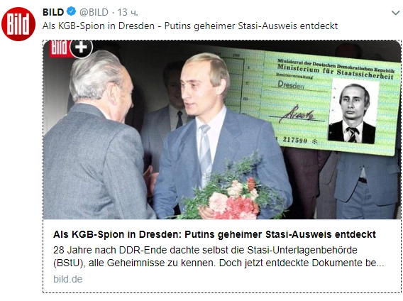 Во вторник, 11 декабря, немецкая газета Bild сообщила, что в архивах бывшего Министерства государственной безопасности ГДР (Ministerium für Staatssicherheit, сокращенно — Stasi, или «Штази» по-русски) было обнаружено удостоверение на имя Владимира Путина. Издание опубликовало фотографию документа.