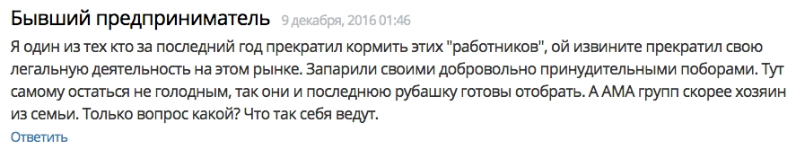 В секции комментариев к материалу предприниматели оставили массу возмущенных отзывов. Вскоре там объявился и сам глава «АМА Груп».