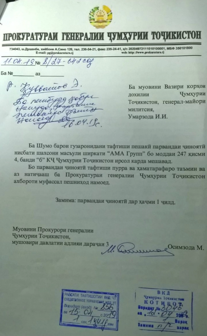 Отправляется Вам для проведения предварительного следствия уголовного дела в отношении ответственных лиц компании «АМА Груп» по статье 247, части 4, пункту «б» УК Республики Таджикистан.