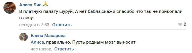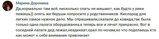 Маску надо было носить. И дистанцию соблюдать. Нет, они ещё снимают, жалуются в соцсети — выписывать таких надо, значит, хорошо себя чувствуют, койку занимают, — написала в комментариях под видео Елена Макарова.
