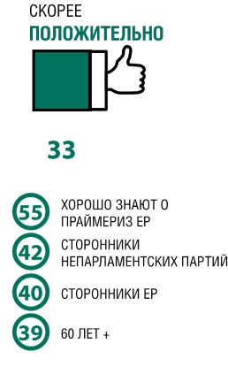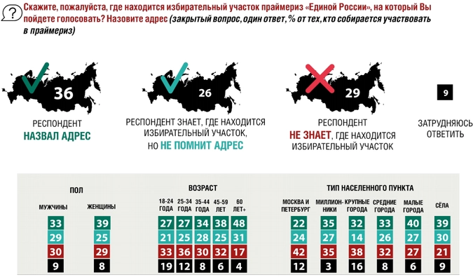 Более того, за неделю до праймериз готовность принять участие в предварительном голосовании партии «Единая Россия» выразила треть респондентов, среди которых 62% смогли назвать местоположение своих избирательных участков, в том числе 36% сказали, что знают точный адрес.