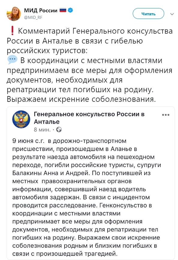 В сообщении генконсульства, опубликованном в Twitter также уточняется, что автомобиль наехал на Анну и Андрея Балакиных на пешеходном переходе.