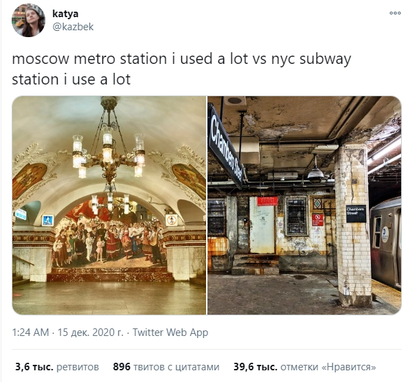 Пользовательница социальной сети Twitter под ником katya@kazbek опубликовала фото двух станций метро — в Москве и в Нью-Йорке. Она предложила своим подписчикам сравнить и наглядно оценить красоту и состояние подземки в одном и в другом городе. Многие ее читатели пришли в ужас.