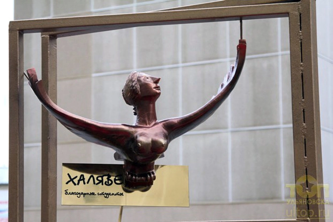 Коллекция странных памятников в городе Ульяновске продолжает пополняться: сначала там появился Николаю Карамзину памятник, изображающий изобретенную им букву "Ё", а теперь художник по куклам местного театра Дмитрий Бобрович установил в городе памятник "халяве". Таким образом он решил увековечить единственную надежду студентов во время сессии, которую он изобразил в виде птице с женским лицом, вылетающую через форточку.