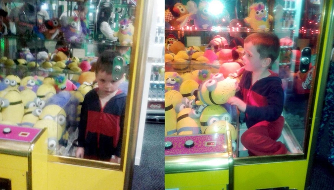 Мальчик хотел достать специальной металлической клешней игрушку — персонажа мультика «Гадкий я» — но не смог этого сделать и решил использовать другой способ. Ребенок проник в автомат, чтобы всё же получить желанную вещь. Однако выбраться из «игрушечного плена» самостоятельно мальчик уже не смог.
