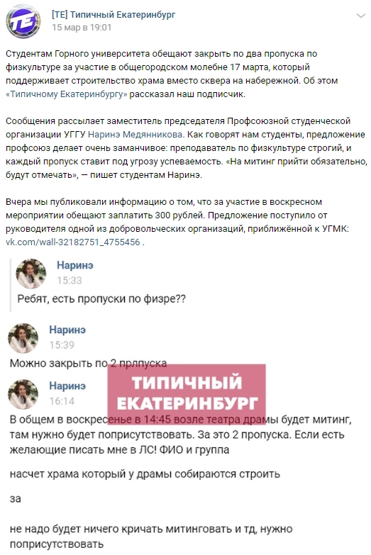 Ранее в группе «Типичный Екатеринбург» в соцсети «ВКонтакте» появился пост, в котором говорилось, что «студентам Горного университета обещают закрыть по два пропуска по физкультуре за участие в общегородском молебне» .