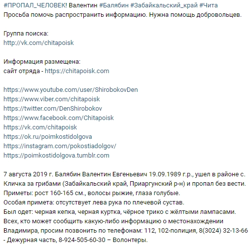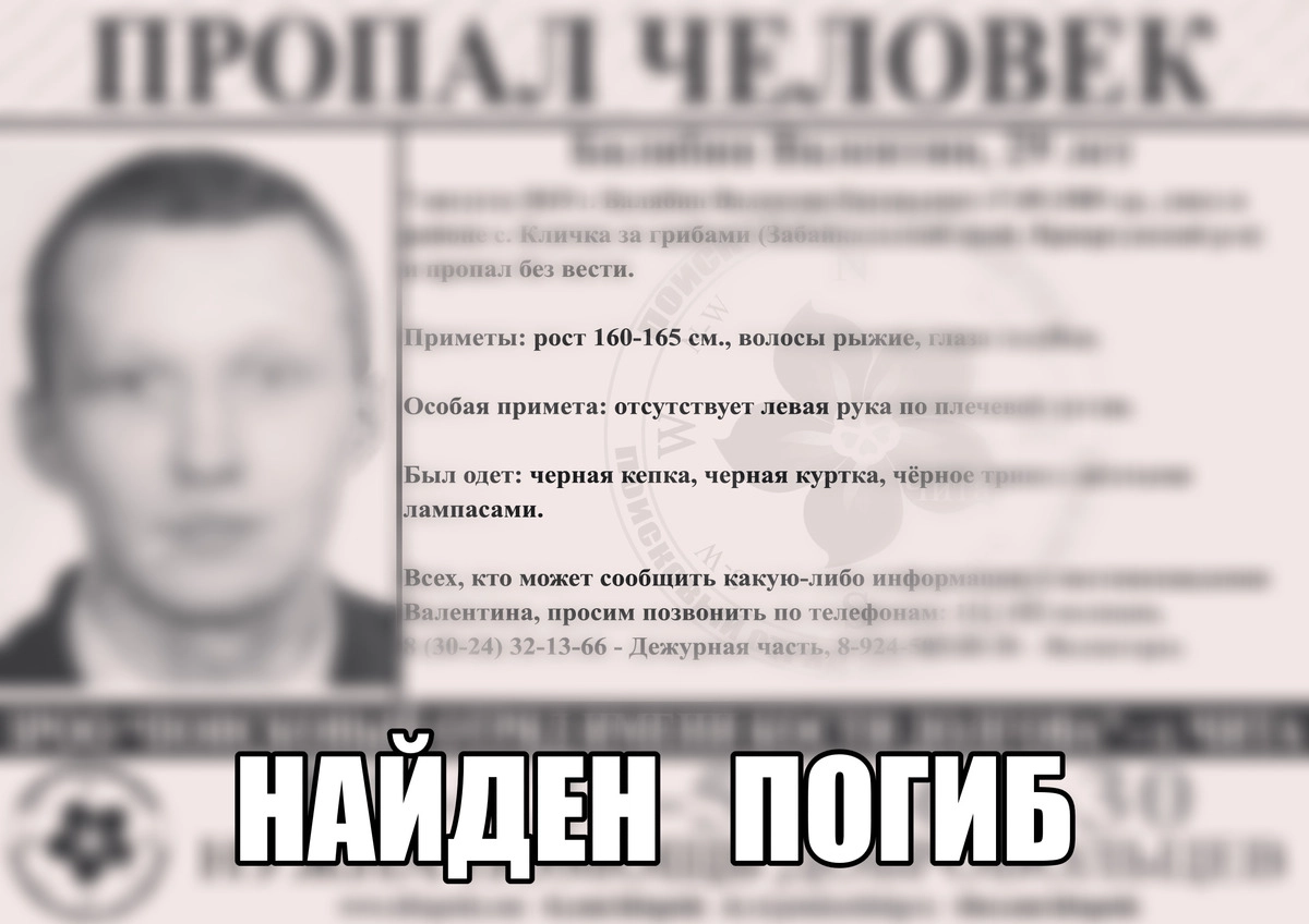 Жители Приаргунского района Забайкальского края на днях нашли мертвым своего земляка Валентина Балябина. 29-летний мужчина-инвалид отправился в лес 7 августа и исчез.