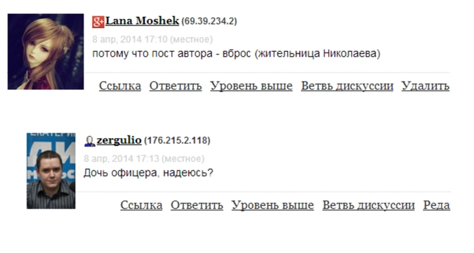 Сразу после публичного разоблачения, все комментарии «жительницы Николаева», содержащие американский ip, были незамедлительно удалены. Однако подобных комментариев от «крымчанок» «офицерских дочек», с пеной у рта доказывающих, что «в Крыму не все так однозначно», в российском сегменте Интернет предостаточно: