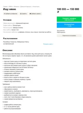 Ранее на «Авито» появилось объявление, что «миллионерша, бьюти-наставник» из Набережных Челнов ищет няню для мужа. Работать предлагалось с 8 до 20 часов за 100–150 тысяч рублей в месяц.