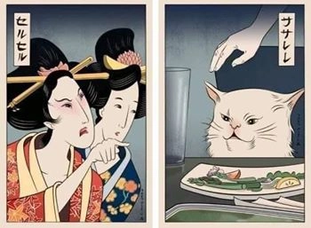 Вы никогда не рассуждали на тему, что мемы — это современное искусство? Так, известная картинка про «женщину, орущую на кота», получила продолжение в иных вариациях. Разнообразие стилей рисовки соответствует различным странам.