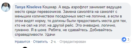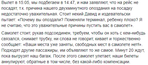 «То есть если все билеты на рейс были проданы, нужно было по-любому кого-то отцепить, не важно, каким способом, главное, не платить компенсацию», — считает автор поста.