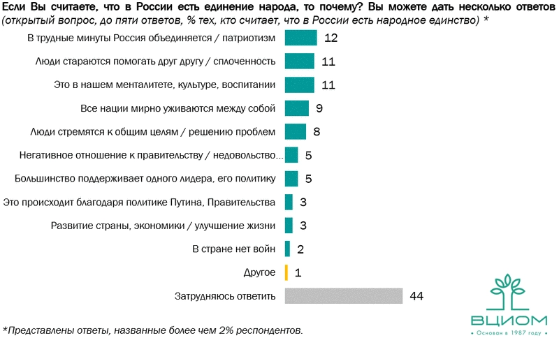 Треть россиян (37%) положительно ответили на вопрос социологов о том, есть ли в нашей стране чувство народного единства, чаще — представители молодежи 18−24 лет (46%) и старшего поколения (40%). Стоит отметить, что за последние семь лет доля россиян, говорящих о наличии народного единства в государстве, увеличилась на 14 пунктов.