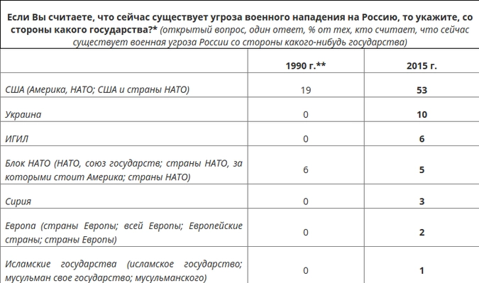 Большинство россиян склонны называть США основным потенциальным агрессором: в наши дни такое мнение высказывают больше половины сограждан — 53%, а в 1990 году — лишь 19%. В то же время Германию, считавшуюся главным врагом 25 лет назад (23%), сегодня к возможным противникам не отнес ни один из респондентов. Кроме того, агрессивная риторика украинских властей насторожила 10% россиян, участвующих в исследовании: