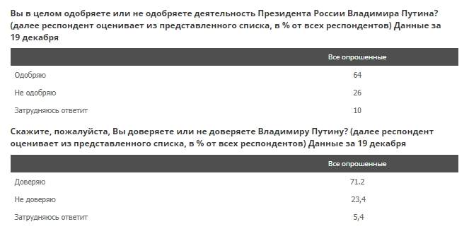 Во время большой пресс-конференции президента РФ Владимира Путина, которая состоялась 19 декабря, уровень одобрения деятельности главы государства вырос до 64%, а показатель доверия российскому лидеру составил 71,2%. Об этом свидетельствуют результаты исследования Всероссийского центра изучения общественного мнения (ВЦИОМ).