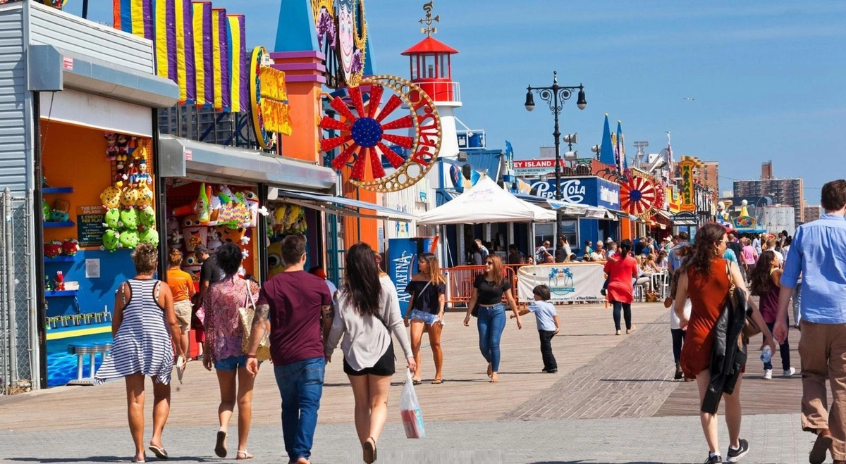 Соседствующий с пляжем Бруклинский парк развлечений представляет собой смесь китча и семейных забав: его деревянная набережная и золотые песчаные пляжи окружены всевозможными аттракционами и точками питания, обслуживающими трудолюбивых ньюйоркцев уже более столетия.