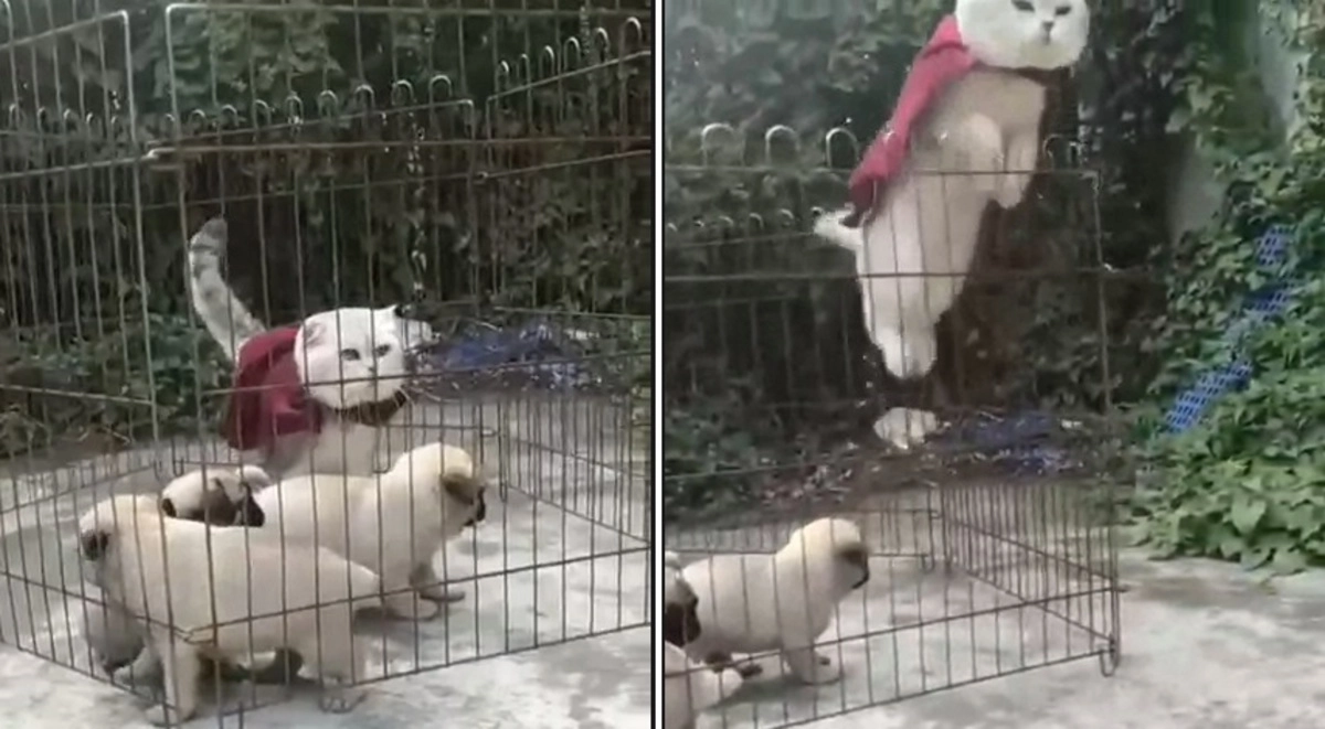 В соцсетях стало вирусным видео с котом в красном супергеройском плаще, который сидит в клетке с маленькими щенками. Правда, находится там пушистый недолго. Немного сдвинувшись в сторону, этот великолепный кот довольно крупного размера совершает удивительно величественный и грациозный прыжок и легко оказывается на свободе. Интернет-пользователей так впечатлил кот-супергерой, что его тут же окрестили спасителем мира.