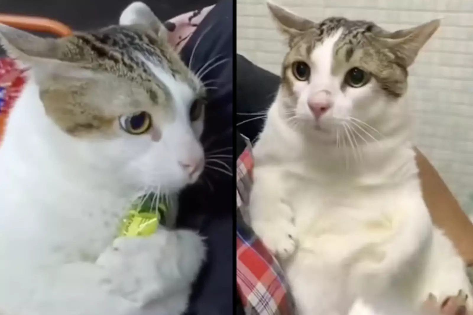 На кадрах питомец пронзает людей своим фирменным взглядом.