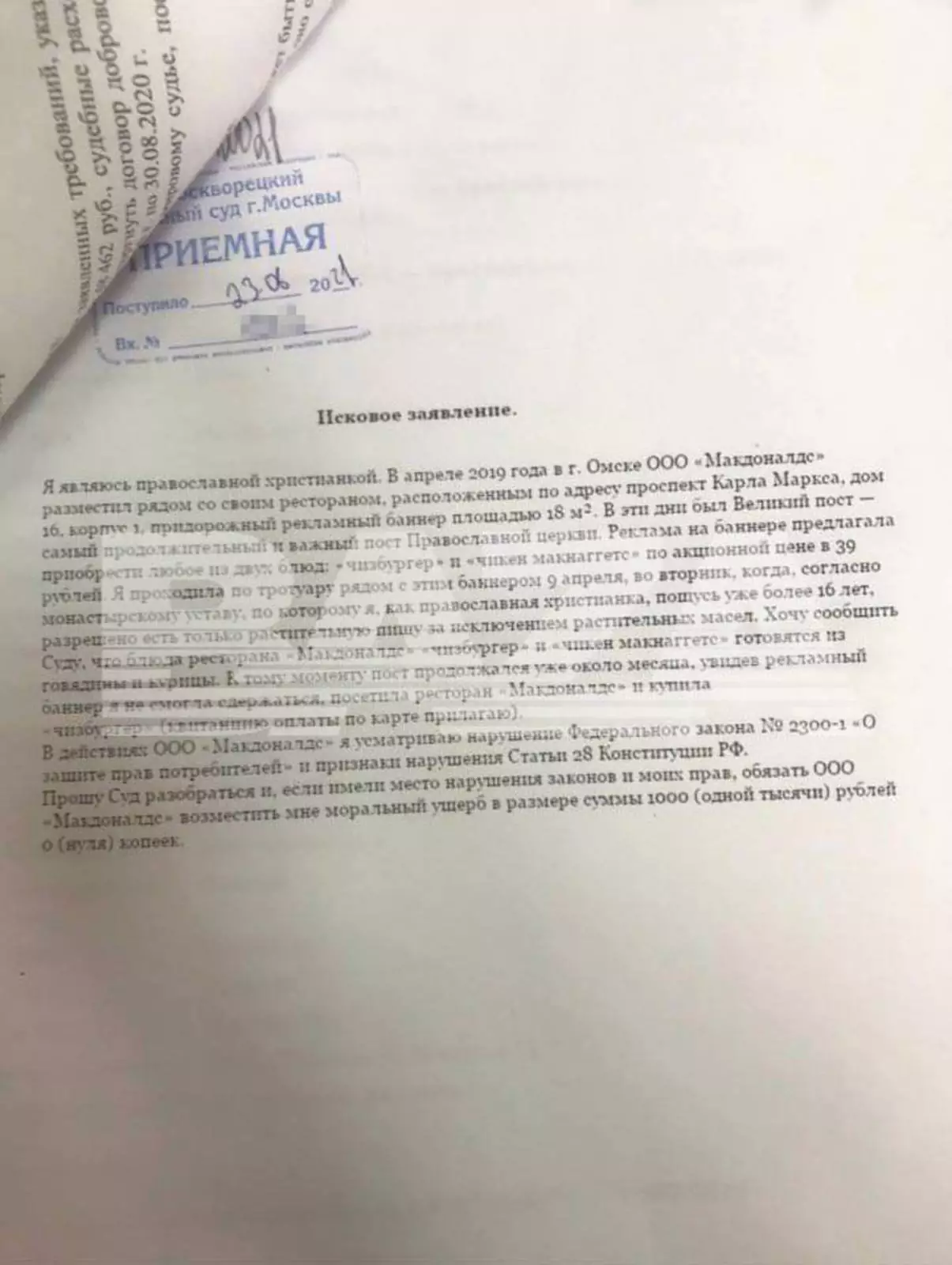 По словам истицы, в апреле 2019 года она находилась в Омске, где заметила на одной из улиц рекламный щит «Макдоналдс», сообщавший об акции на чизбургеры и чикен-макнаггетс. Пикантность ситуации заключалась в том, что в это время у православных уже месяц как длился Великий пост, который верующая женщина строго соблюдала уже 16 лет, а оба блюда имеют в составе мясо.