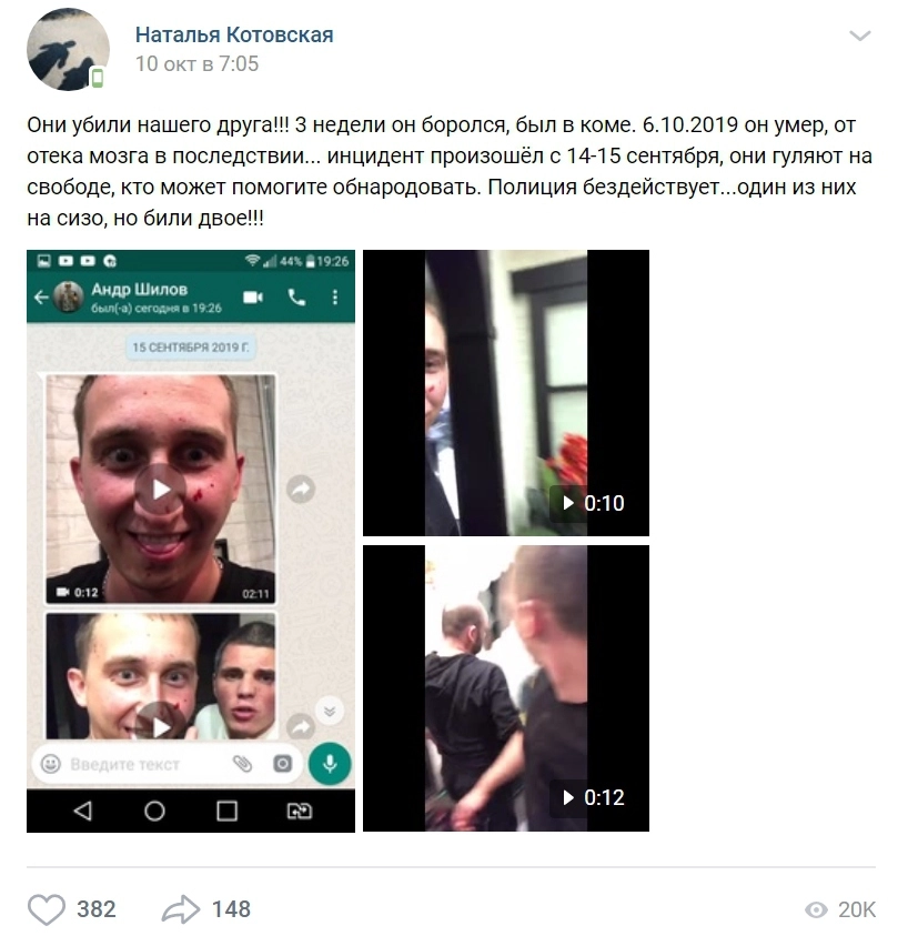 Знакомая погибшего Наталья Котовская рассказала на своей странице «ВКонтакте», что при этом Шилов присылал ей видео избиения. Сын депутата заснял свое окровавленное лицо на фоне происходящего — в ролике можно увидеть, как он улыбается и показывает язык. По словам Котовской, пострадавший впал в кому, врачи пытались ему помочь три недели. Однако 6 октября он скончался от отека мозга.