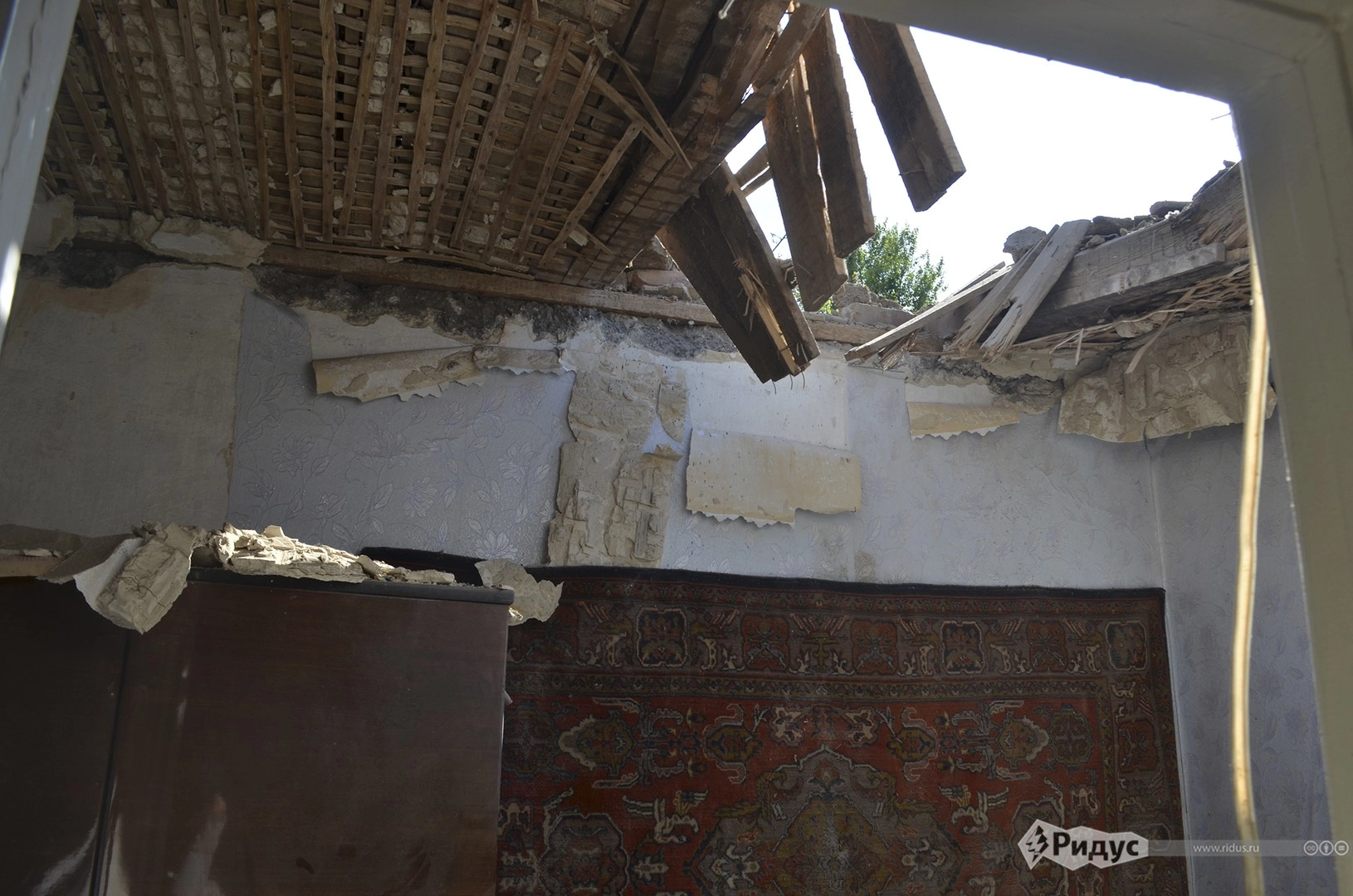 Вот частный дом на Альпинистов, 13. Тоже Донецк. Мина прилетела в крышу дома, где живет пожилая женщина. Сама она чудом осталась жива: будучи инвалидом, успела покинуть здание с обваливающимся потолком. Шла, опираясь на стул.