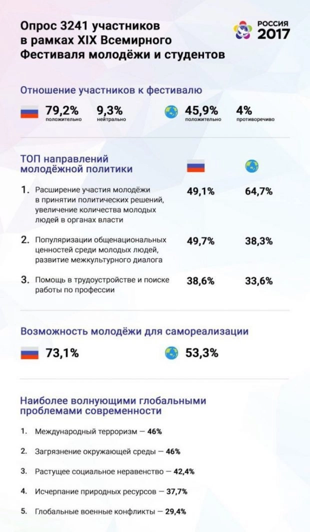 Как показал опрос участников фестиваля, наиболее значимые для молодых людей темы, которые поднимаются в рамках мероприятия, — это участие молодежи в органах власти, общенациональные ценности, межкультурный диалог, трудоустройство и выбор профессии, проблема международного терроризма, экология, глобальные военные конфликты и ограниченность природных ресурсов.