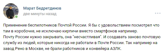 «Первый в истории „Почты России“ беспилотник оказался тяжелее воздуха», — отметил один из них.