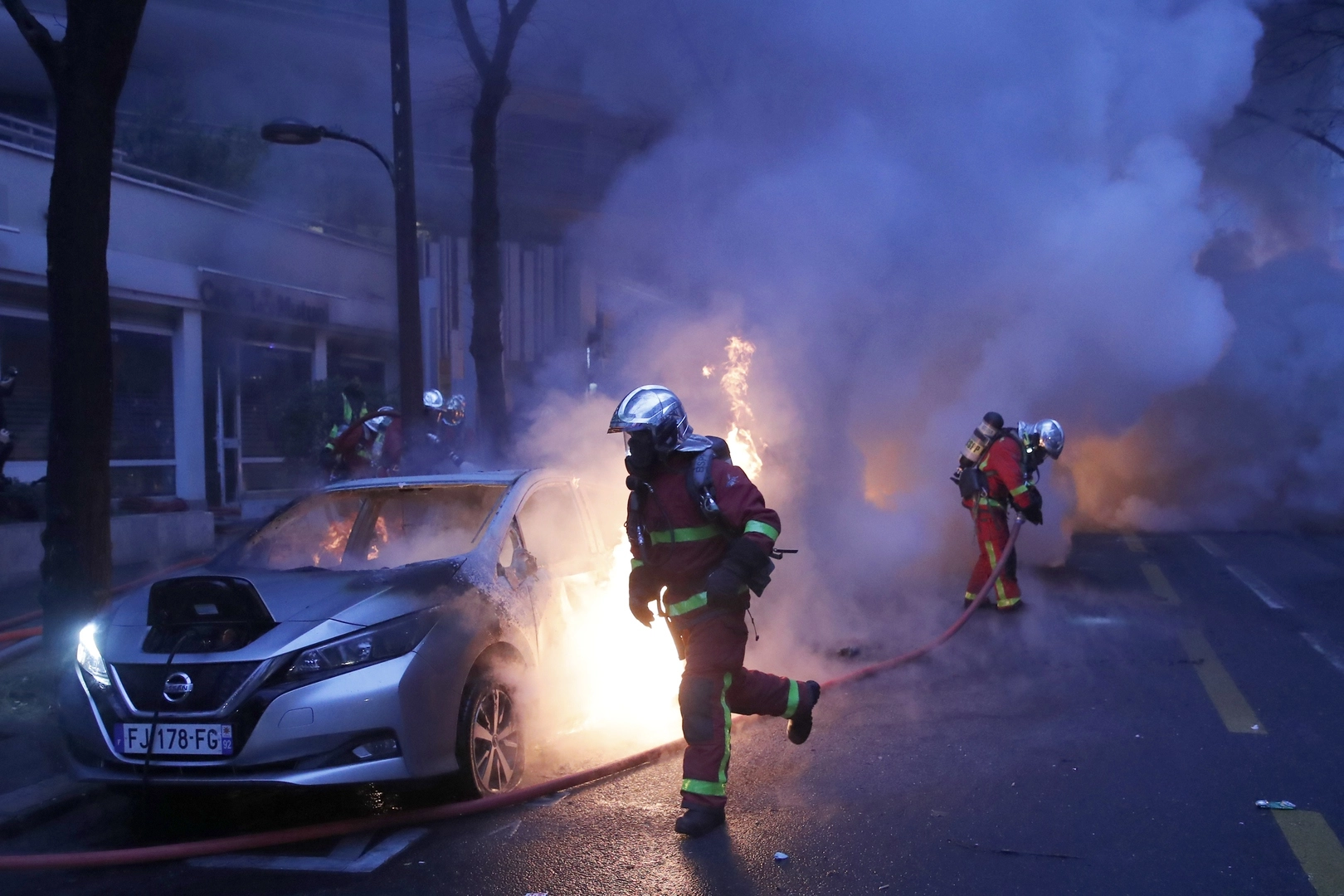 В результате в Париже насчитали как минимум три подожженных автомобиля. Они попали на видео.