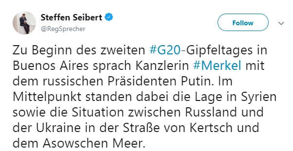 В центре внимания находились при этом обстановка в Сирии, а также ситуация, возникшая между Россией и Украиной, в Керченском проливе и в Азовском море, — написал Стеффен Зайберт в Twitter.