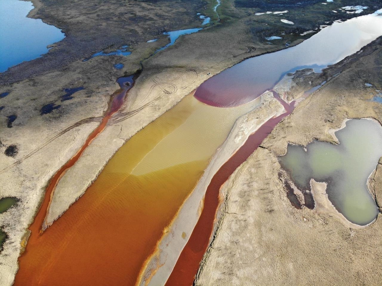 Местные власти вынуждены были ввести в окрестностях Норильска режим ЧС межмуниципального уровня из-за того, что воды двух местных рек окрасились в кроваво-красный цвет.