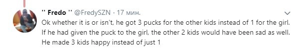 «Папа должен учить мальчиков, что „сначала дамам“»,«Почему этот парень ограбил ее дважды?», «Похоже, отец троих детей хотел получить шайбы для всех», «Он получил три шайбы для всех детей вместо одной для девочки. Если бы он дал шайбу девочке, остальные двое детей расстроились бы. Он сделал трех детей счастливыми вместо одного», — написали пользователи.