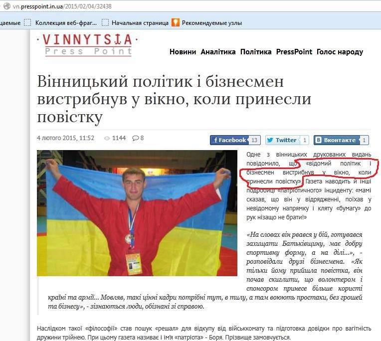 4 февраля в одном из интернет-изданий появилась статья о том, что я якобы «выпрыгнул в окно, когда принесли повестку из военкомата». Официально заявляю, что я физически не мог этого сделать, поскольку квартира, куда приносили повестку находится на четвертом этаже (ну, не на 16-м же — прим. «Ридус», почему же невозможно?), и дома меня в то время не было («в то время», когда что? — прим. «Ридус»). Кроме того, в статье (статья о которой речь, удалена — прим. «Ридус») приведено много фактов, построенных на собственных мыслях автора, которые не соответствуют действительности и являються ложными, отметил в своем заявлении Борис Максимчук, глава Винницкой областной организации «Европейская партия Украины».