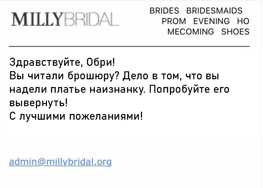 Две недели назад я получила свадебное платье. Я была невероятно расстроена из-за того, что оно выглядело совершенно не так, как на фото. Я написала огромный гневный отзыв продавцу, в котором попросила отдать мне деньги. Так вот, оказалось, что я надела его наизнанку! Черт, кто знал, что свадебные платья отправляют вывернутыми! Я примерила платье повторно, и оно просто потрясающее. Я хочу официально извиниться перед магазином и поблагодарить за то, что решили проблему (которой оказалась я). P. S. Я опубликую фото в платье только после свадьбы, придется подождать.