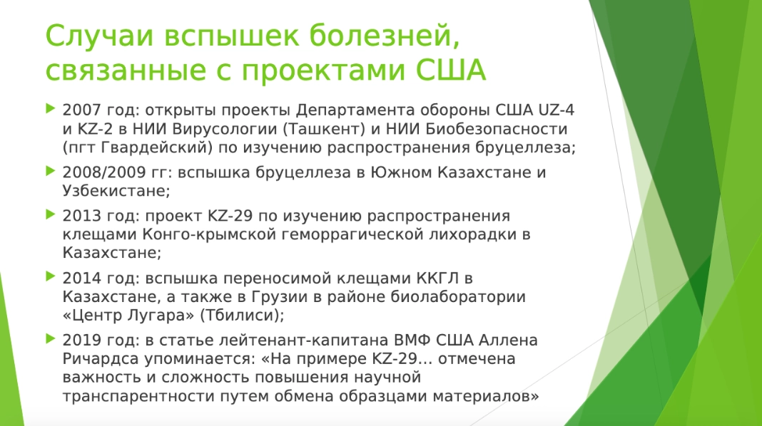 «До этого в 2013 году американцы начали финансировать изучение той самой лихорадки в казахской лаборатории KZ-29. Кураторами проекта выступили капитан-лейтенант ВМФ США Аллан Ричардс и лейтенант ВМФ США Кристина Фаррис. Мы полагаем, что изучение штаммов лихорадки велось сначала в Казахстане, затем материалы были перевезены в лабораторию, которая находится Грузии. То ли там случилась утечка, то ли это было плановое заражение», — рассуждает Никита Мендкович.